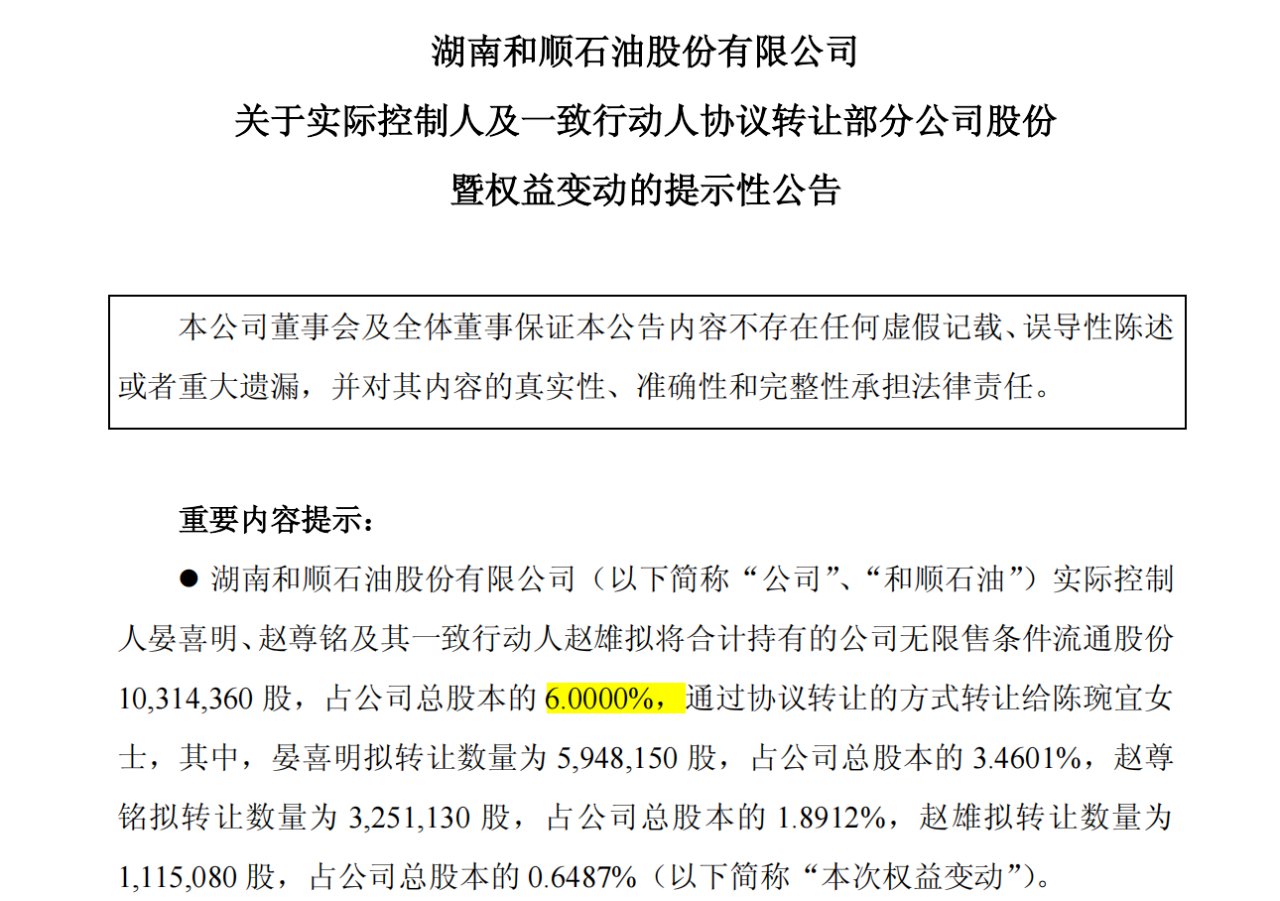 第二部分是和顺石油实际控制人及相关方向陈琬宜转让上市公司股份。公司实际控制人晏喜明、赵尊铭及其一致行动人赵雄,拟通过协议转让方式向陈琬宜合计转让公司6%的股份。