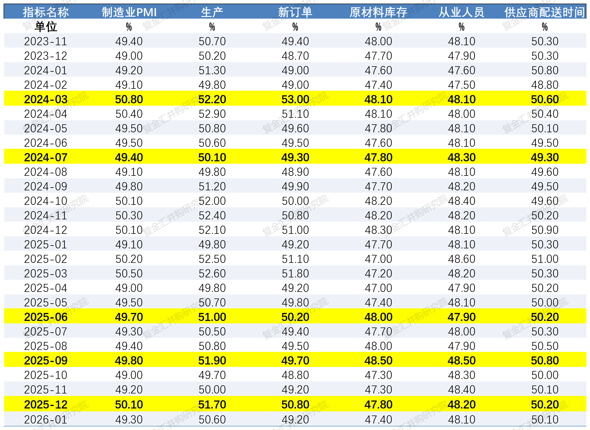 制造业PMI调查指标体系涉及生产量、新订单、出口订货、现有订货、产成品库存、采购量、进口、购进价格、原材料库存、从业人员、供应商配送时间等11个指数。