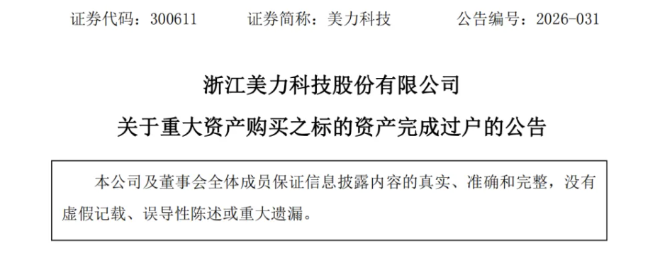 2026年3月30日,复金汇并购班校友企业浙江美力科技股份有限公司(300611.SZ)发布公告,宣告其重大资产购买项目完成标的资产过户。